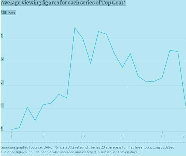 Рейтинги передачи были ниже, чем при Кларксоне. Если первый эпизод сезона с Эвансом в Великобритании посмотрели 4,3 миллиона зрителей, то последний около двух миллионов. По количеству зрителей сезон вышел неудачным — посмотрите на график в The Guardian, таких рейтингов не было с пятого сезона, когда Top Gear только набирал популярность. Эванс до выхода передачи в эфир говорил, что меньше пяти миллионов зрителей на эпизод он будет считать провалом.