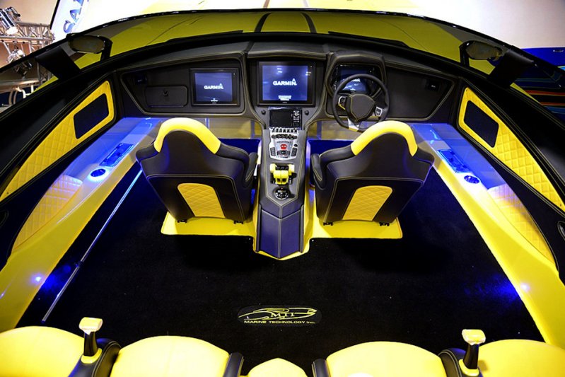 Ну, а для тех, кто ищет мощнейших и острейших ощущений на воде, есть другое предложение. Компания Marine Technology Inc строит по-настоящему безбашенные лодки с двумя двигателями Mercury, суммарная мощность которых достигает 2700 л.с. Они способны разгоняться до умопомрачительных для водной глади 300 км/ч. Однако интересно, что по требованию заказчика, внешность такого водного болида может быть подогнана под любой сухопутный автомобиль, да и список опций не менее впечатляющий, чем в соответствующем автосалоне. На текущий момент под заказ уже были произведены катера со внешностью Ferrari, Chevrolet Corvette и Lamborghini Aventador LP 720-4. Стоимость новой лодки приближается к 2 млн $, однако из вторых рук можно приобрести всего за 500 000$.