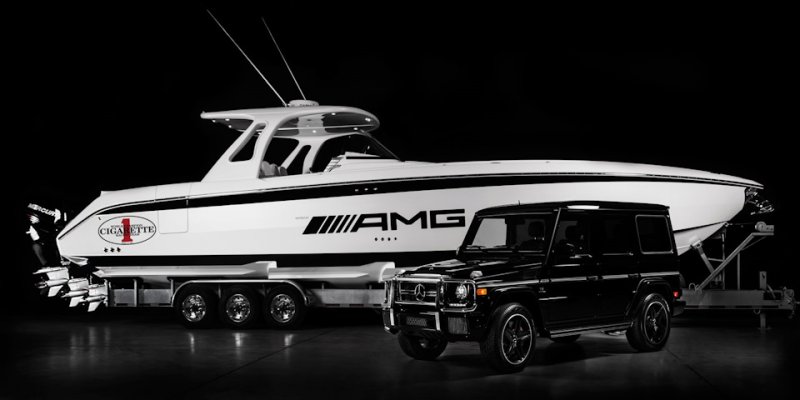 Достаточно активно Mercedes сотрудничает с производителем скоростных катеров Cigarette Racing. Вдохновившись легендарным G 63 AMG те построили 12,8-мертровый катер с 5-ю 6-цилиндровыми двигателями Mercury, суммарной мощностью 1750 л.с. и разгоняющийся до 125 км/ч. Та же команда, вдохновившись Mercedes C63 AMG Black Series создала 2700-сильную лодку. Еще интереснее Cigarette AMG Electric Drive Concept, прообразом которой стал Mercedes-Benz SLS AMG Electric Drive. У него два электродвигателя от суперкара, суммарной мощностью 2220 л.с., способные разгонать катер до 160 км/ч.