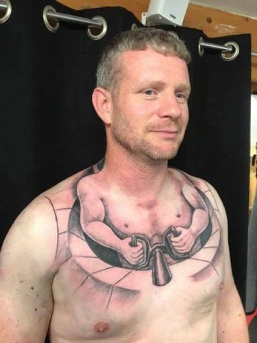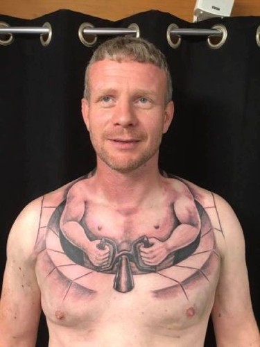 Водитель грузовика с юмором отнесся к своей работе, наколов на груди маленького человечка, управляющего его телом.