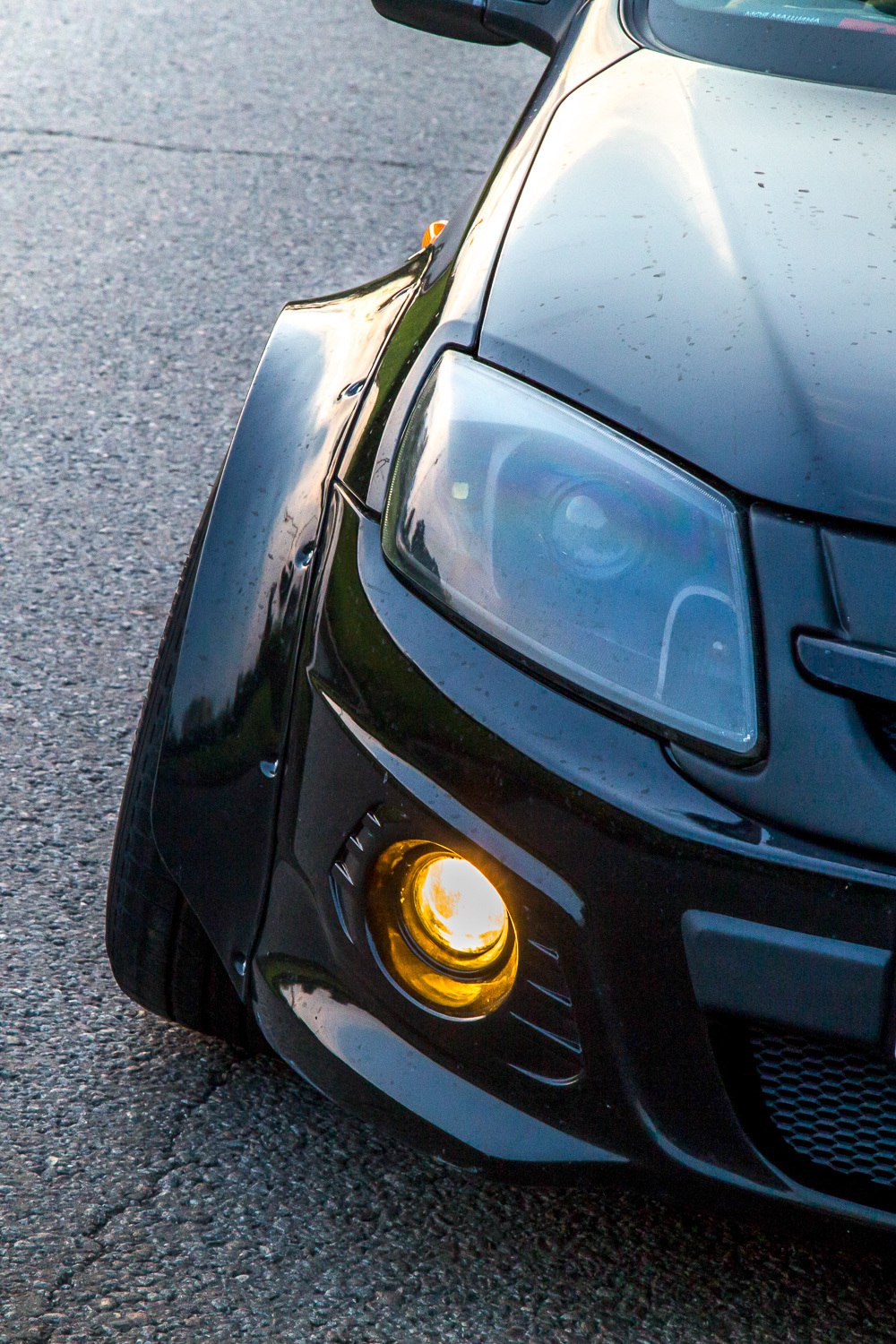 Такие колеса терли буквально все. Выхода было два: либо раскатать арки, либо резать их и заваливать колеса. После долгих раздумий, остановились на втором варианте, как более подходящем. Да и когда колесо торчит из кузова сантиметров на 10, то одной раскаткой, как ни крути, не обойтись. Арки надо было резать, вопрос стоял лишь в том, насколько. Владелец решил безжалостно и по максимуму выпилить их и установить фендеры. От подобных идей трудно удержаться, ведь современный рынок тюнинга сплошь и рядом наполнен широченными обвесами, накладками и колесами с невообразимыми параметрами. А тут еще и у друга на машине стояли фендеры от компании Clinched. Примерил, понравилось. Была ни была! Там же, в Clinched, заказал себе самые большие из универсальных накладок, шириной 10 см, очень приятного дизайна New School.