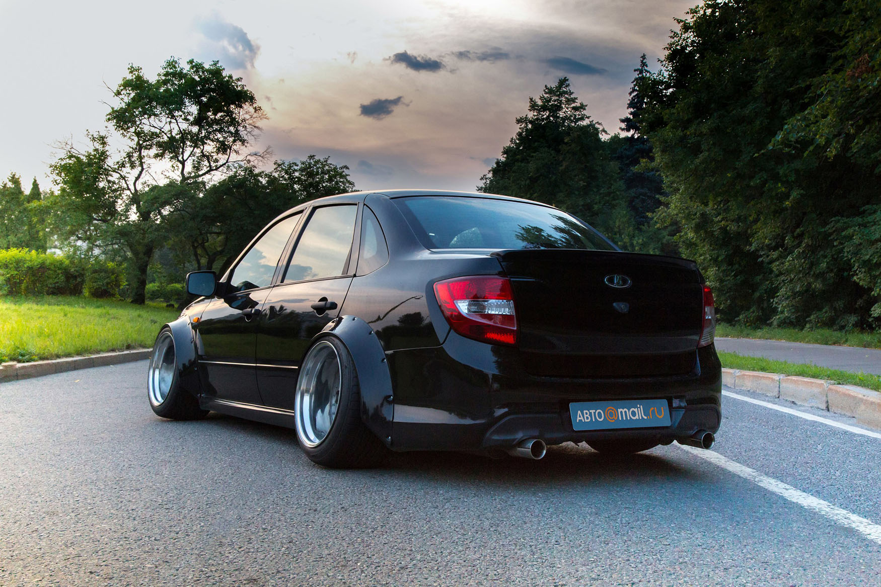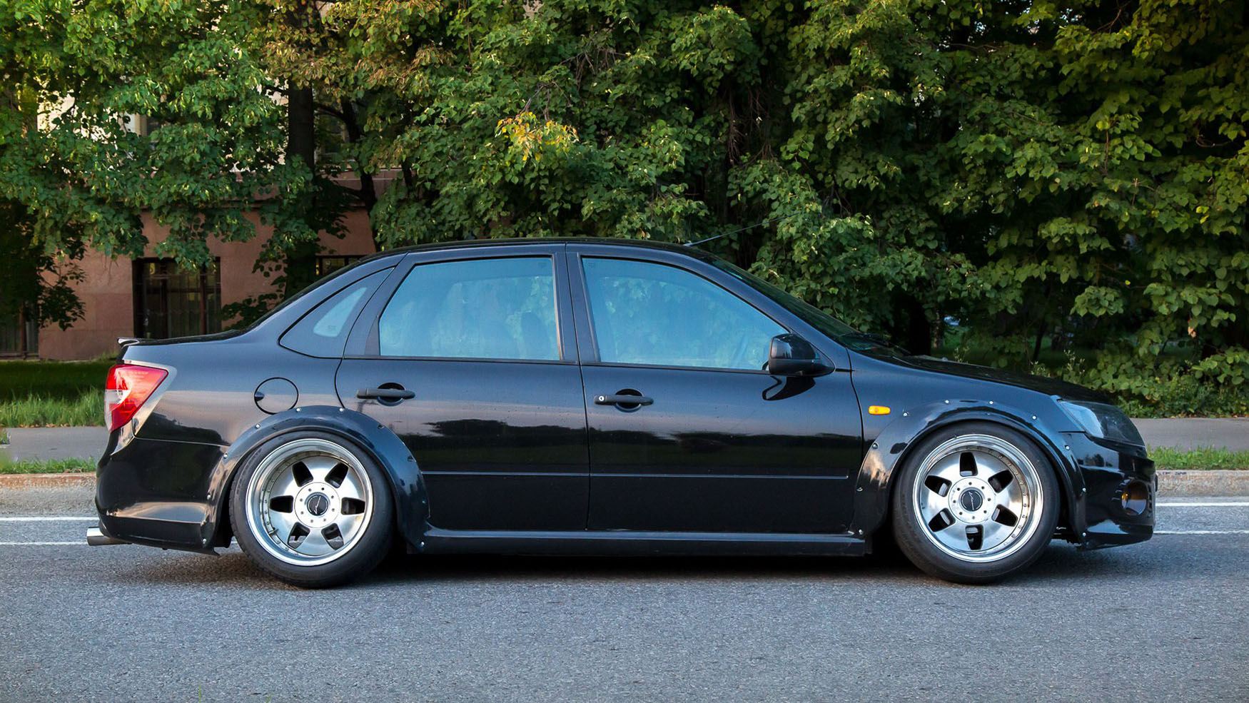 Процесс сборки оказался не самым простым, возникли некоторые сложности. Например, из 30 отверстий для болтов совпали только 10. Остальные 20 пришлось пересверливать. Кроме того, колеса потребовали больших усилий по восстановлению — отполировать до блеска иннеры, которые мало кто вообще полирует, задача непростая. В качестве награды за проделанные труды Максим получил недорогой комплект крутых дисков с нешуточными параметрами: ширина передней пары 11,5 дюйма, задней — 12,5 дюйма. Резину выбрал соответствующую — размерностью 275/35. И это для «Лада Гранта»!