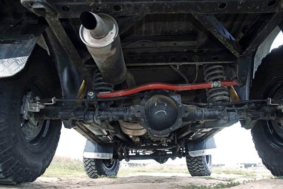 Задний мост «переставлен» с рессор на пружины, впереди и сзади установлены регулируемые тяги Панара
