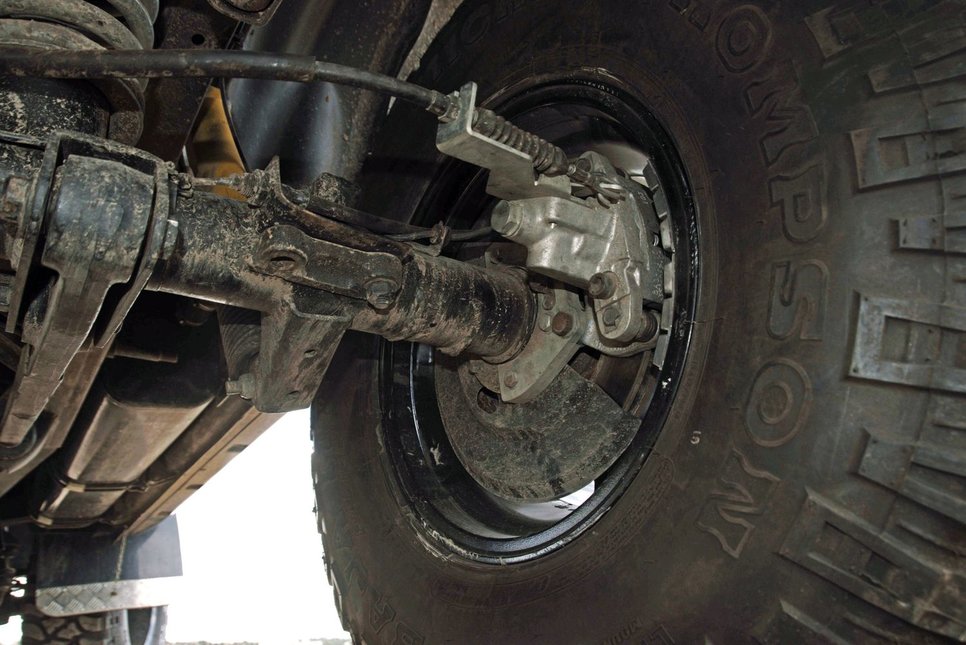 Без серьезного увеличения диаметра колес с такой задачей не справиться, поэтому подвеску доработали для установки покрышек диаметром 35 дюймов. Для этого, в дополнение к кузовному «лифту», подвеску тоже «отлифтовали», заодно переставив задний мост Патриота с рессор на пружины и заменив дисковыми задние барабанные тормоза. Пружины взяли из комплекта производства РИФ, амортизаторы — Old Man Emu, на передней и задней осях появились регулируемые тяги Панара. Новая подвеска дала «прирост» в пять сантиметров, еще шесть с половиной сантиметров добавили проставки под кузовом, общий результат — примерно 11,5 см «лифта» — «тридцать пятые катки» влезают с запасом. С таким запасом, чтобы их можно было легко поменять на диагональные арочные покрышки низкого давления, незаменимые на слабых грунтах.