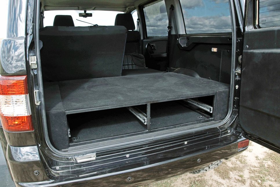 Органайзер в багажнике вместе со сложенным диваном образует удобный двухместный спальный отсек с ровным полом (на фото из органайзера вынуты ящики, видны направляющие, по которым они движутся на роликах)
