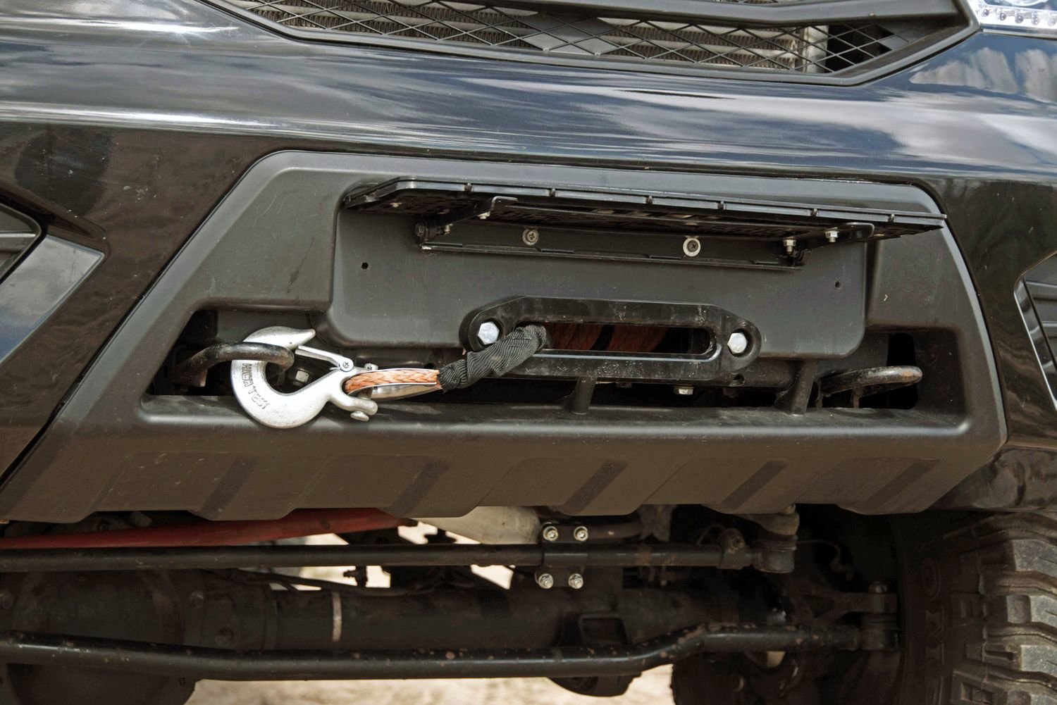 Передний бампер стандартный, в нем на усилителе скрытно установлена лебедка Off-road Master 12000. Пока не поднимешь рамку номерного знака, ее присутствие выдает только крюк, закрепленный в проушине, но его можно снять для большей «конспирации»