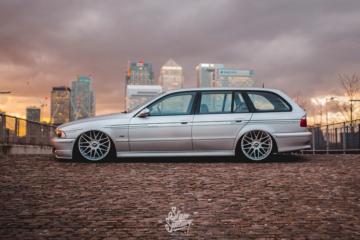 Это Alpina B10 3.3 Touring, созданная на базе универсала BMW 5-серии в кузове E39. Выпущено таких Alpina было всего 80 экземпляров, а сейчас перед нами ещё более редкий вариант - с правосторонним расположением руля. Кстати, собираются такие автомобили вовсе не вручную - сборка происходит на заводах BMW, куда Alpina поставляет собственные комплектующие.