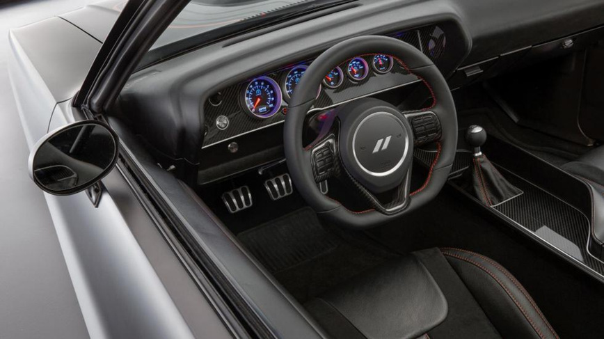 Салон автомобиля также выполнен из деталей, позаимствованных у современных моделей. Внутри есть каркас безопасности, спортивные кресла, современное рулевое колесо, специально подготовленная приборная панель, много карбона, кожа и алькантара.