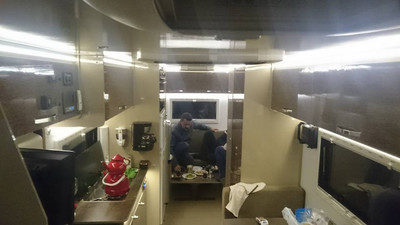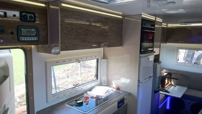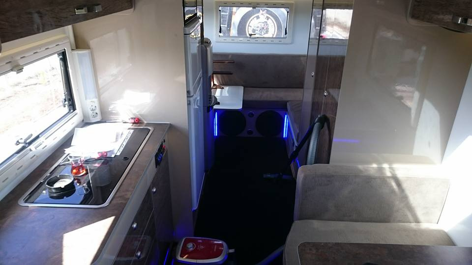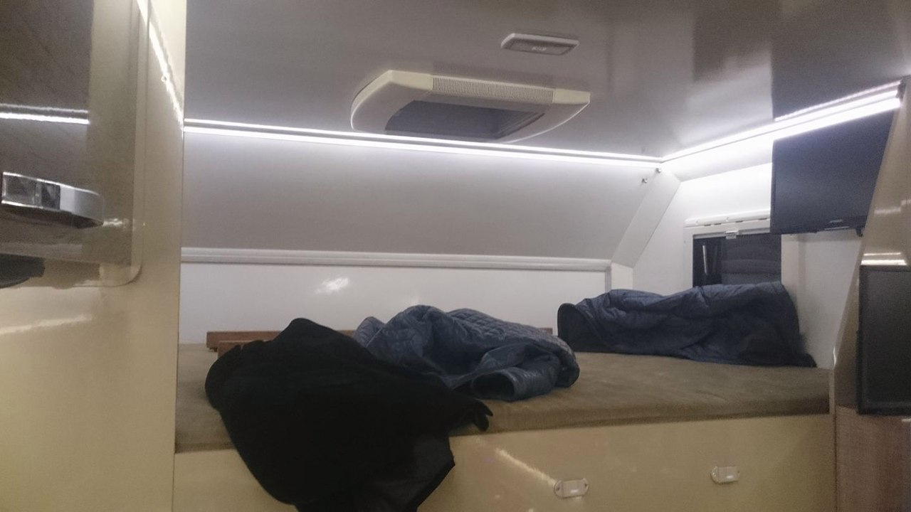 Внутри есть все необходимое для комфортного проживания двоих: кухня, биотуалет, душ, несколько телевизоров, холодильник, кондиционер и даже мощная аудиосистема. Широкая двухспальная кровать разместилась в индивидуальной "комнатке" над кабиной.