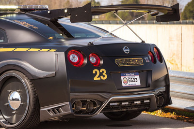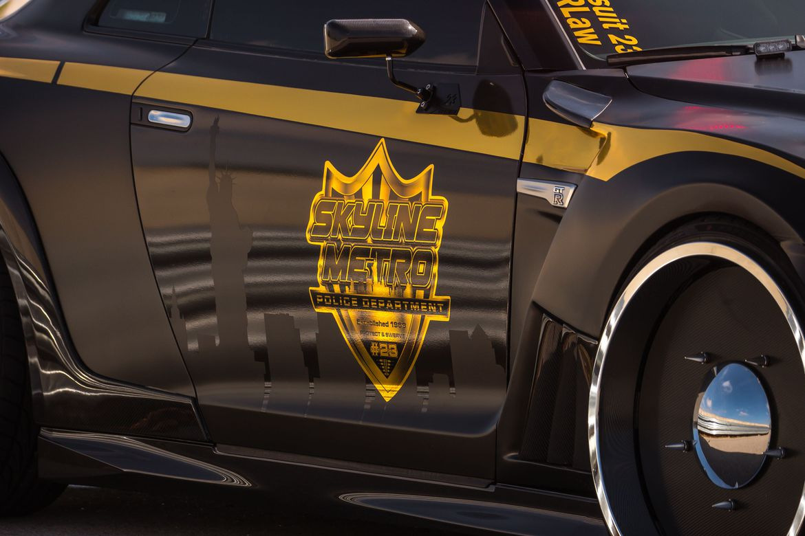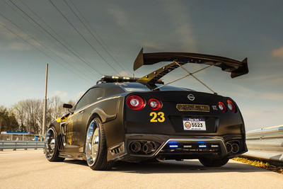 Это Nissan GT-R Pursuit 23, прозванный "Copzilla", и он является уникальным проектом, заказанным Nissan специально для шоу в Нью-Йорке. У него есть все атрибуты полицейского автомобиля, среди которых проблесковые огни, сирены, расцветка, кенгурятник и очень особенные колёса, а ещё некоторые элементы тюнинга вроде регулируемых койловеров и огромного антикрыла сзади.