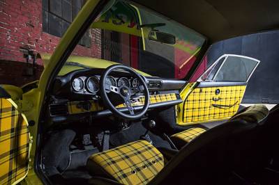 А теперь загляните в салон. Он просто прекрасен! Шотландка жёлтых оттенков, в которую были перешиты и сиденья-ковши, и дверные панели, и даже вставки на передней панели, мало того отлично сочетается с оттенком кузовом, так ещё и сама по себе выглядит очень стильно. По-настоящему прекрасный Porsche.