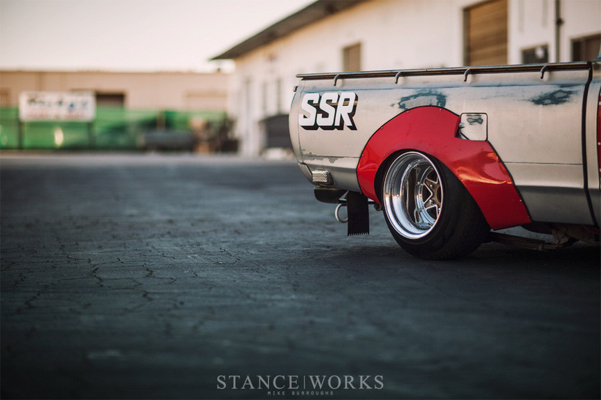 И уже через неделю Лэндон подъехал на нашу парковку для съёмки. Он приехал на синей Toyota Tacoma с лифт-китом и чумовыми Volk TE37, а на прицеп был погружен Datsun. Он поступил так из-за того, что двухчасовая поездка до места съёмки на жёсткой подвеске не обещала быть приятной, а делать её мягче нельзя, так как стиль превыше всего остального. Даже пока он перемещался по парковке, грузовой отсек то и дело подпрыгивал.