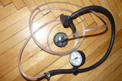 - еще один способ с модифицированной крышкой. В крышку аналогичную той, что установлена на бачке, нужно врезать автомобильный ниппель. Затем надеть крышку с ниппелем на бачок, затем надеть один конец шланга с зажимом для подсоединения на крышку, а второй на запасную камеру, накачанную не больше 1 атмосферы. Открываете штуцер и стравливаете жидкость с пузырьками воздуха.