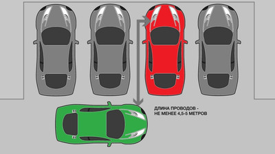 Большинство проводов, продающихся в автомагазинах, имеют длину 3-3,5 метра. Но худшая диспозиция с точки зрения прикуривания – когда машина с разряженной батареей стоит в ряду других носом к стене, а машина-донор подъезжает к ней со стороны багажника. Такая ситуация не редкость на организованных парковках. Поскольку длина массовых седанов B-сегмента – около 4,5 метров, чтобы учесть неудачный расклад, провода должны быть как минимум пятиметровыми.