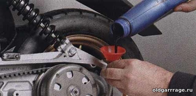 Кстати объём масла зачастую пишется на корпусе редуктора. Перепроверьте данные введя модель и марку скутера в интернете. Заливку масла лучше всего делать при помощи специального шприца для масла, но если такого нет, можно помучатся медицинским, правда позаботьтесь заранее купив кубатурой побольше. Зачатую канистры с трансмиссионным маслом оснащены специальной лейкой если ширина заливного отверстия позволит то это будет самый быстрый и удобный способ. Ещё как вариант можно использовать лейку со шлангом на конце.