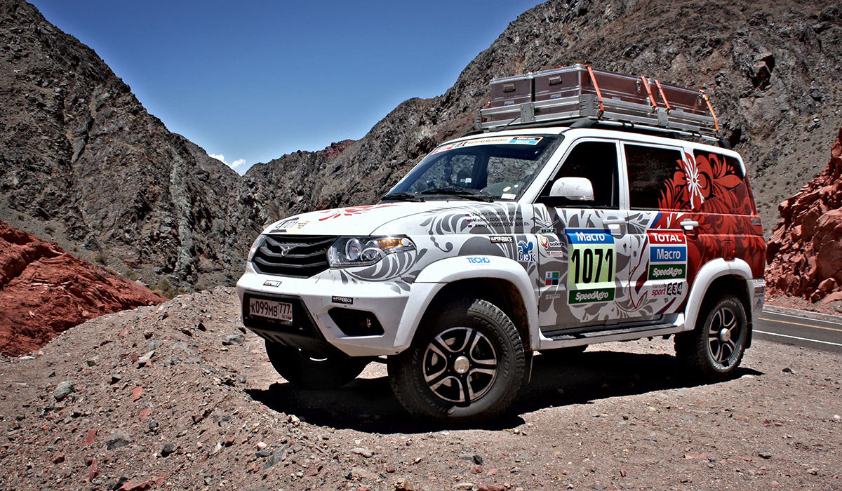 Серийный УАЗ Патриот (из доработок — только «зубастые» покрышки) с бензиновым двигателем ЗМЗ выехал на знаменитый ралли-рейд «Дакар» в качестве машины сопровождения. 14 тысяч километров прошел внедорожник через горы и пустыни, выдержав перевалы через Анды на высоте 5 000 метров и 50-градусную жару.